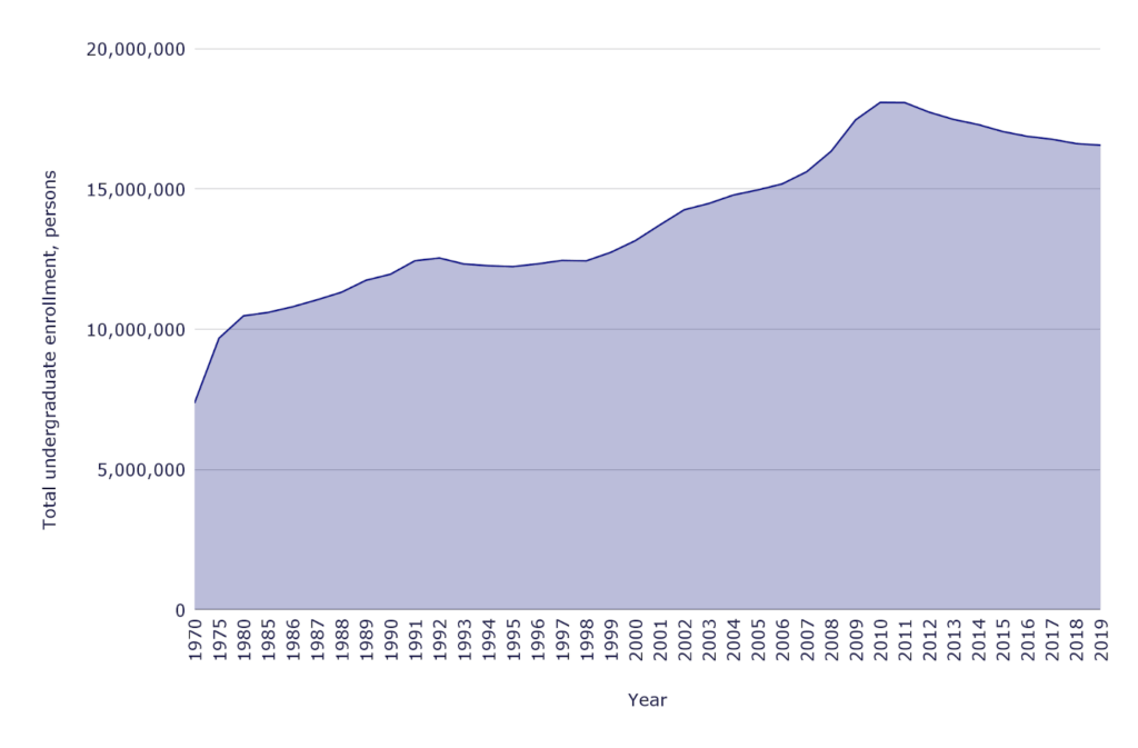 The chart tracks total undergraduate enrollment in the United States from 1970 through 2019, capturing long-term expansion followed by a gradual downturn. By visualizing changes in the undergraduate population over five decades, the data helps clarify what undergraduate enrollment and how the total number of undergraduate students shifted before the pandemic disruption.