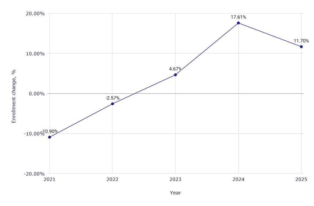 - Enrollment began recovering in 2024, rising to 968,895 students, an increase of about 50,622 year-over-year.
