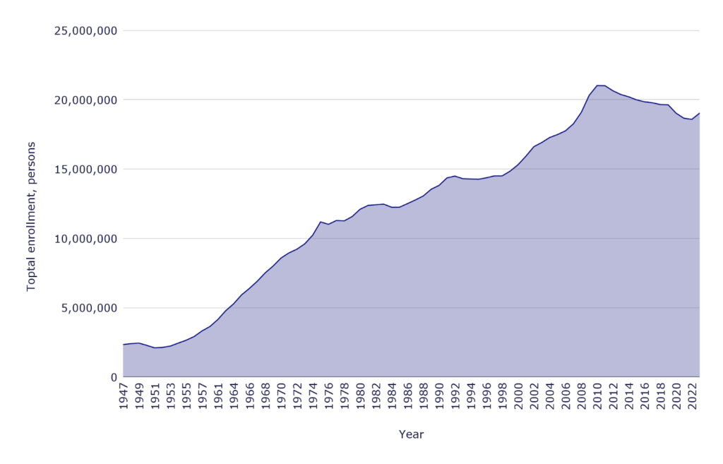 The chart illustrates total U.S. postsecondary enrollment over time, highlighting both long-term dynamics and the sharp disruption caused by the COVID-19 pandemic. It provides clear context for ongoing questions, such as whether college enrollment is declining and whether college enrollment is down, using historical enrollment levels to show how recent losses compare with past growth cycles.