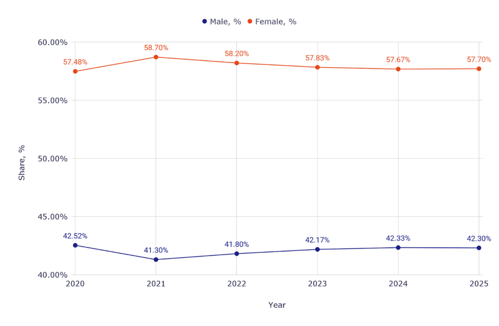- From 2022 through 2025, the female share of undergraduate students remained between 57.67% and 58.20%, indicating stability in gender composition.