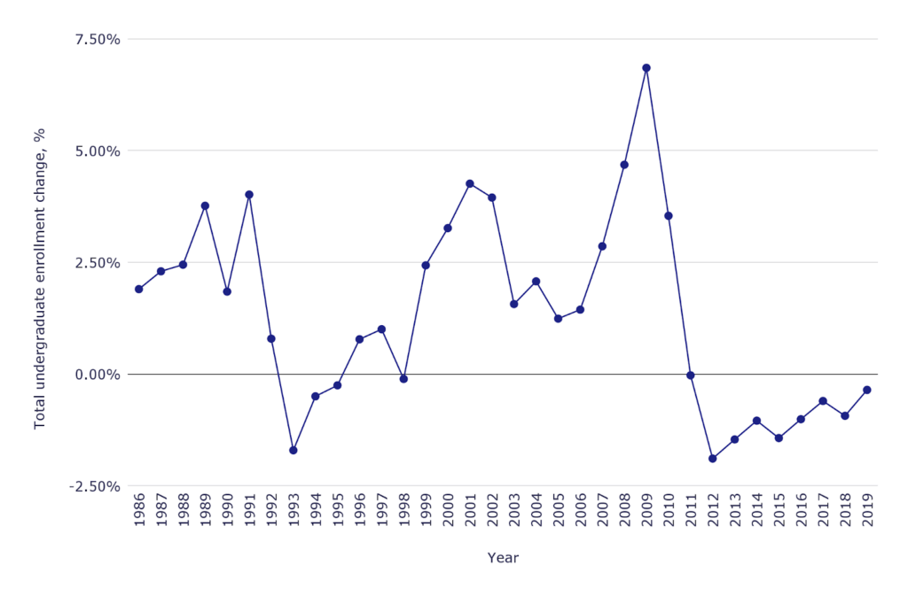 - From 2012 to 2019 alone, the undergraduate population fell by roughly 1.18 million students, signaling that undergraduate enrollment was already trending downward years before the pandemic.