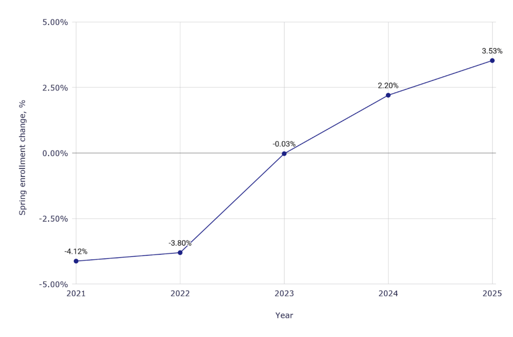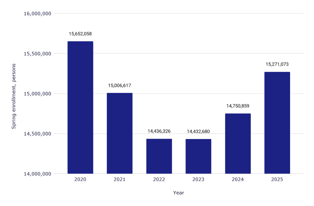 - “Clearinghouse Enrollment Insights Series: Current Term Enrollment Estimates Spring Report.” National Student Clearinghouse Research Center Home, 22 May 2025, https://nscresearchcenter.org/final-spring-enrollment-trends/. Accessed 19 December 2025.