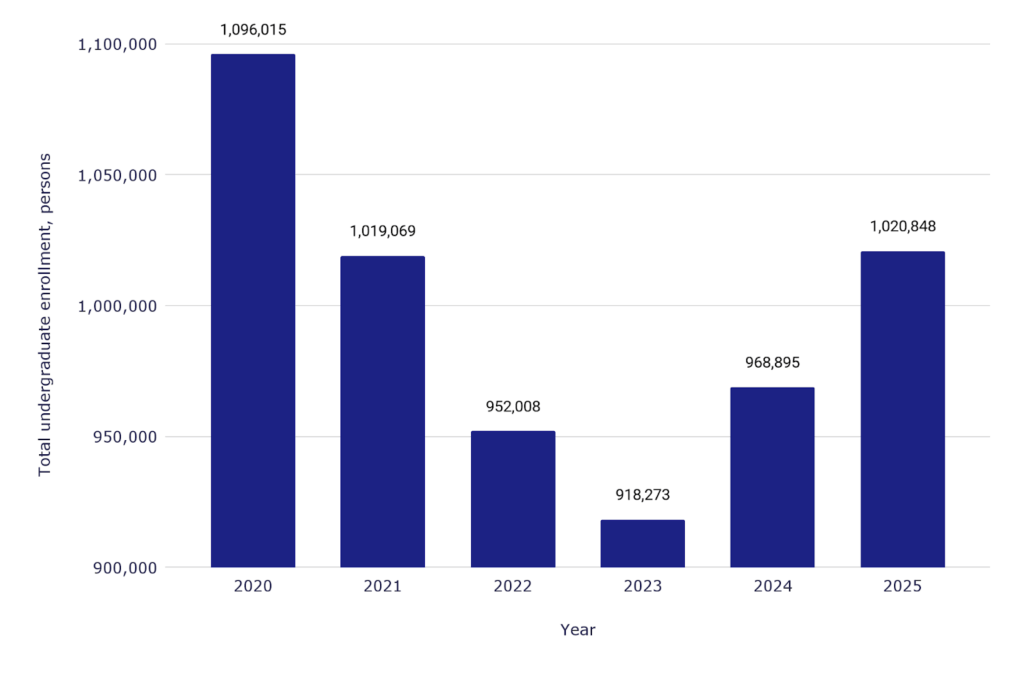 Undergraduate enrollment began recovering in 2024, with community colleges reaching 1,020,848 students by 2025, approaching pre-pandemic levels.