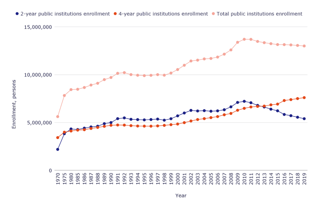 Community college enrollment dropped sharply during the 2010s, falling from 7.22 million in 2010 to 5.40 million in 2019, while 4-year public institutions continued to grow.