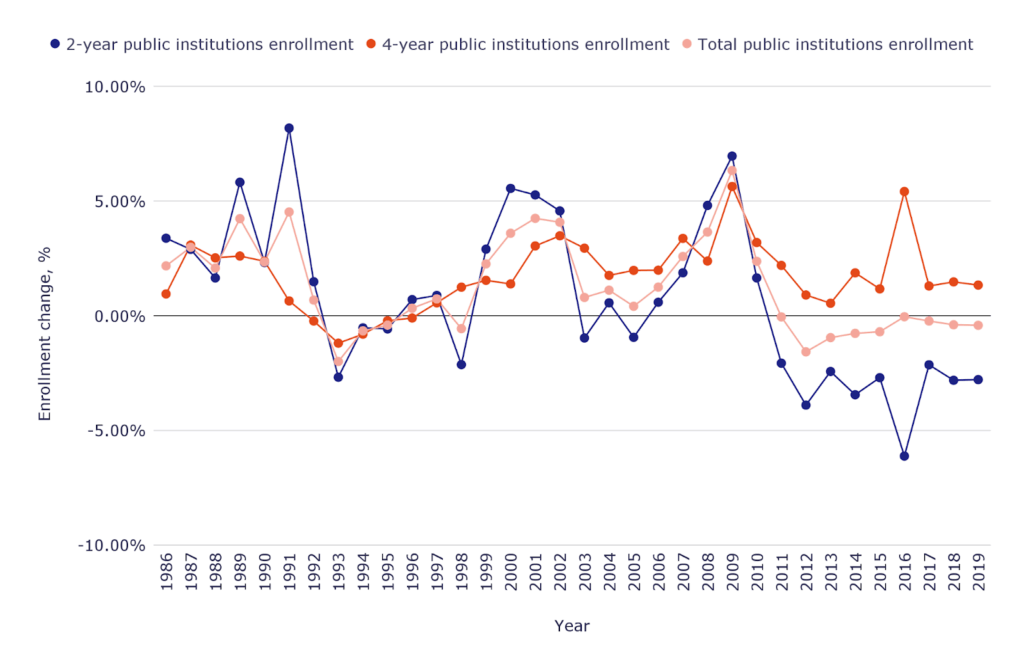 - Community college enrollment fell sharply in 2021 and 2022, with year-over-year decreases of -7.02% and -6.58%, reflecting the most severe post-pandemic impact.