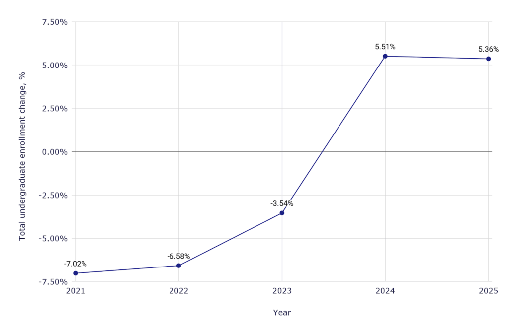 - Enrollment rebounded strongly in 2024 and 2025, rising by +5.51% and +5.36% respectively, signaling a rapid recovery in undergraduate students.