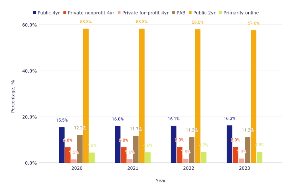 - The number of adults last enrolled in public 4-year institutions rose from 6.1 million in 2020 to 7.0 million in 2023, increasing their share from 15.5% to 16.3%.