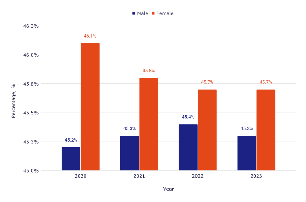 Gender composition has remained stable over time, with men and women each representing roughly 45-46% of the SCNC population.