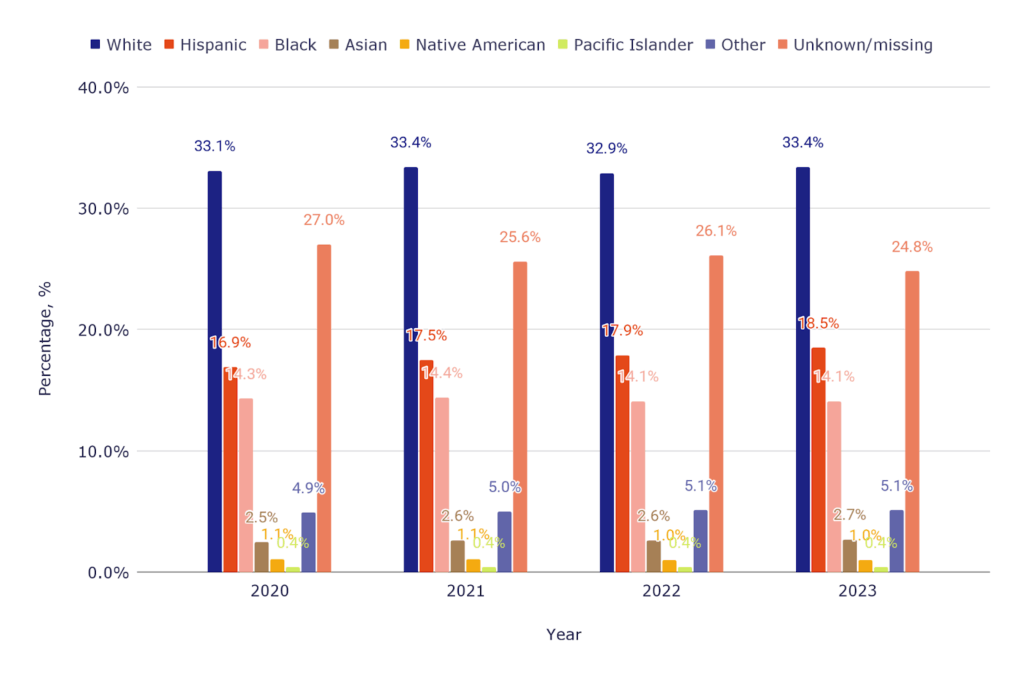 | Year of entry | American Indian/Alaska Native, % | Asian, % | Black, % | Hispanic, % | Pacific Islander, % | White, % | Two or more races, % | Nonresident, % |