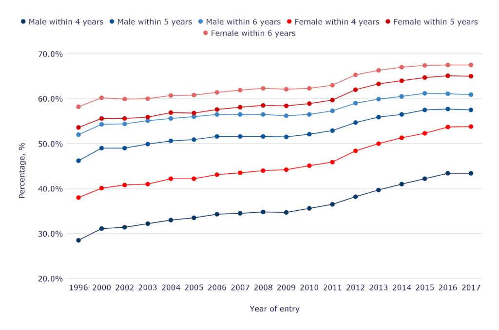 Across all cohorts, female students demonstrate higher graduation rates than male students within four-, five-, and six-year timeframes. Although both genders show steady improvement in degree completion since the late 1990s, the persistent gap suggests structural or behavioral differences affecting student persistence. Overall, the data indicate that closing the gender gap remains a critical factor for improving aggregate graduation outcomes in four-year programs.