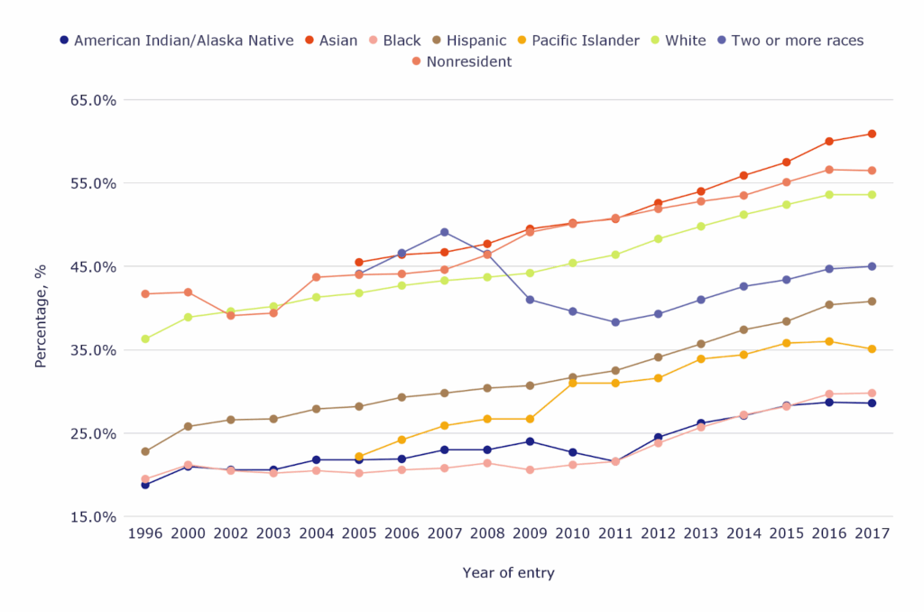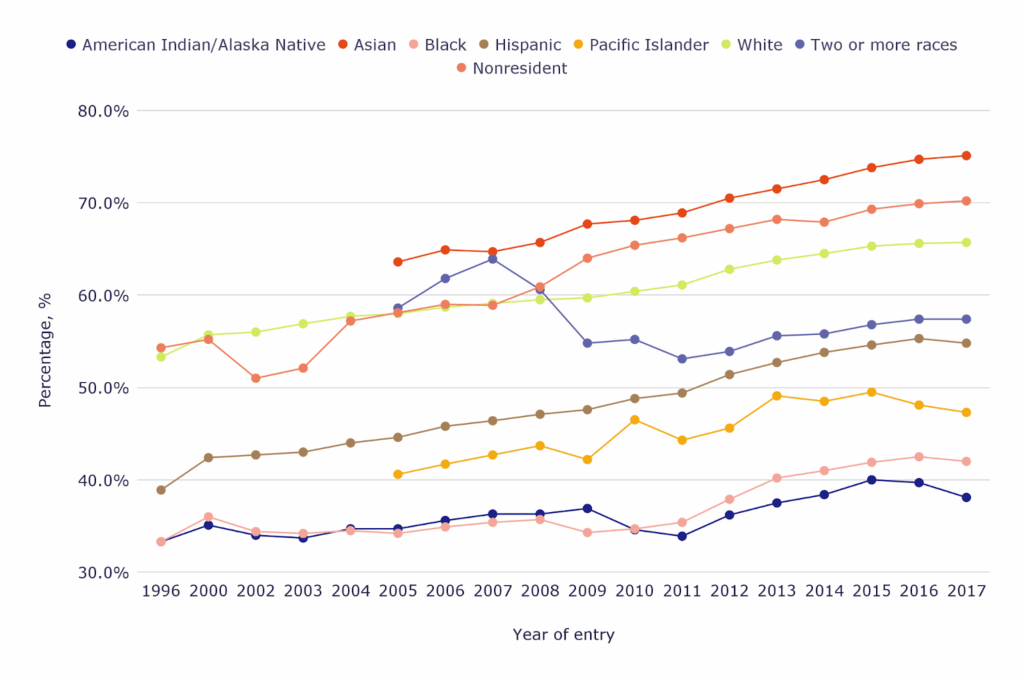 - For the 2017 entry cohort, Asian students had the highest six-year graduation rate at 78.3%, compared with 41.3% for American Indian/Alaska Native students, indicating a 37 percentage point gap.