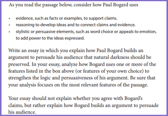 To get a high score for Analysis, you’ll need to explain and evaluate the author’s arguments. So, when reading the passage, identify his central claim and instruments he uses to support it (reasoning, evidence, stylistic elements). Focus on the most relevant and persuasive ones.